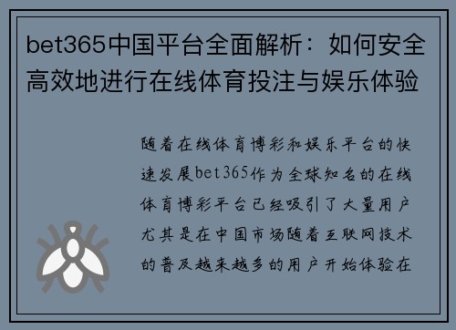 随着在线体育博彩和娱乐平台的快速发展,bet365作为全球知名的在线体育博彩平台,已经吸引了大量用户。尤其是在中国市场,随着互联网技术的普及,越来越多的用户开始体验在线体育投注和娱乐场景。本文将从四个方面全面解析bet365中国平台的安全性、便捷性、游戏体验及支付系统,帮助用户了解如何安全高效地进行在线体育投注与娱乐体验。我们将探讨如何选择合适的投注项目、如何提高博彩体验的安全性、如何在平台上进行高效操作以及如何管理资金的进出,确保在享受娱乐的同时,能够最大程度避免风险。