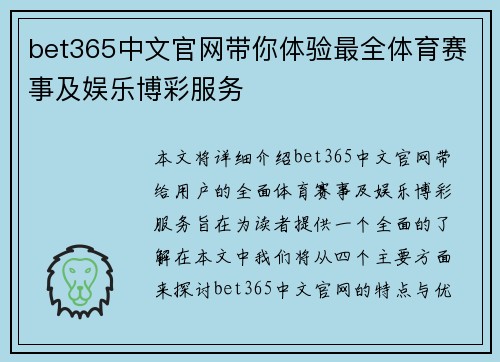本文将详细介绍bet365中文官网带给用户的全面体育赛事及娱乐博彩服务,旨在为读者提供一个全面的了解。在本文中,我们将从四个主要方面来探讨bet365中文官网的特点与优势,分别是:平台体育赛事的多样性、娱乐博彩的丰富选择、平台的用户体验与技术支持,以及其安全性与合法性。每一部分都会详细展开,帮助用户更好地理解如何在bet365中文官网上享受到全方位的博彩体验。无论是体育迷,还是娱乐博彩爱好者,都能从中找到适合自己的投注方式。接下来,我们将逐一阐述这些内容,全面呈现bet365中文官网的独特魅力。