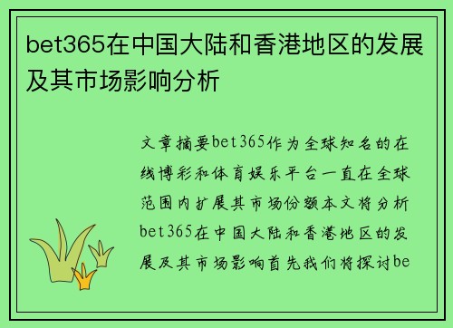 bet365作为全球知名的在线博彩和体育娱乐平台,一直在全球范围内扩展其市场份额。本文将分析bet365在中国大陆和香港地区的发展及其市场影响。首先,我们将探讨bet365在中国大陆和香港地区的合法性问题及其运营模式,分析如何在这两个地区的法规框架下进行有效运营。接着,文章将阐述bet365如何通过技术创新、市场营销策略等手段获得用户的青睐,并在竞争激烈的市场中脱颖而出。然后,文章将重点分析bet365对当地经济、文化及社会的影响,包括其对博彩行业的促进作用和可能带来的负面影响。最后,本文将总结bet365在中国大陆和香港地区的发展经验,并提出对其未来发展的展望。通过这些多角度的分析,本文旨在为了解bet365在这两个地区的运营与影响提供全面的视角和深入的思考。